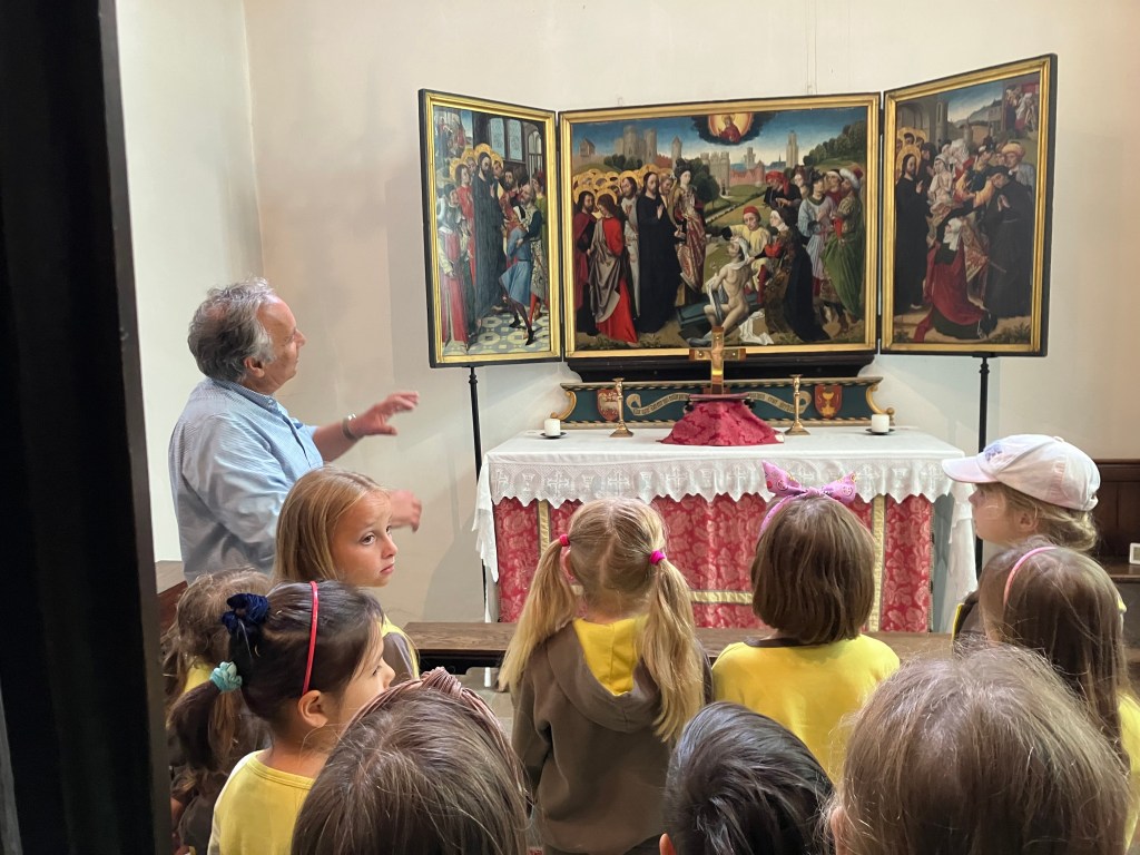 After a snack and quick run around we walked to St Johns Almshouse. Where trustees and showed us around these 600 year old social housing equivalent. Also the very rare and precious triptych artwork. Costumes were shown of the uniform that residents were expected to wear and very strict rules of being allowed to reside there. We were even allowed to have our picnic in their very pretty enclosed rear garden.